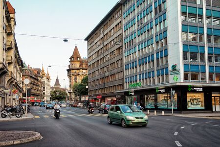 Geneva, Switzerland - August 30, 2016: Street with road in the city center of Geneva, Switzerland. People on the background