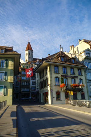 Thun, Switzerland - August 25, 2010: Old Houses on the Embankment Aare river in the Old Town of Thun in Switzerland. Canton of Bern.