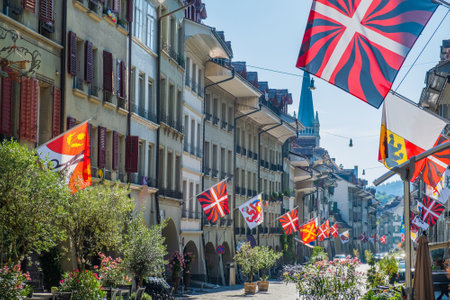 Thun, Switzerland - August 8, 2019: Shopping street in the old town of historical city Thun. Swiss flag waving on the street. People walking in the pedestrian zone. Colorful flowers as a decoration.