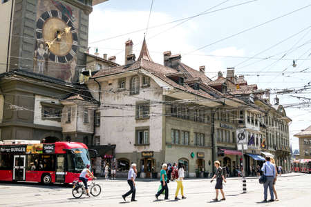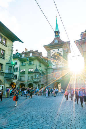 Bern, Switzerland - 23 AUG 2018: People on the shopping alley with the Zytglogge astronomical clock tower of Bern in Switzerland.