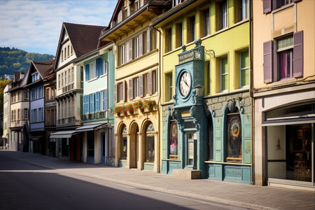 Quiet urban street with modern buildings and traditional architecture in a Swiss city during daytime