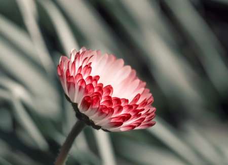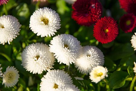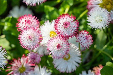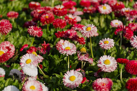 White and red daisy flowers blooming in the lawn during spring. Bellis perennis Pomponette English Daisy.