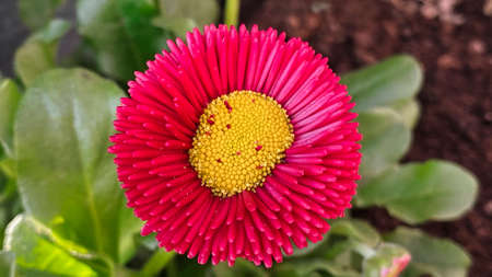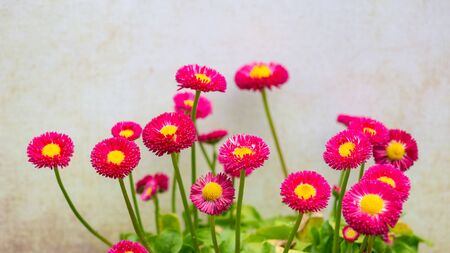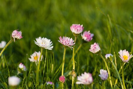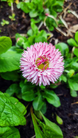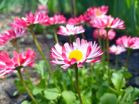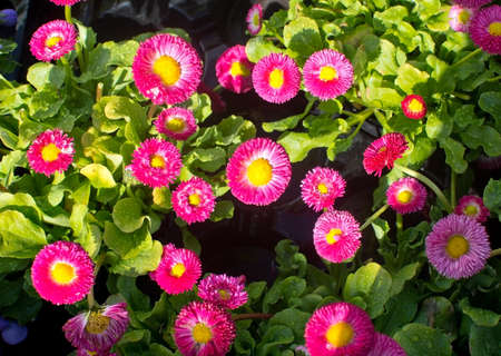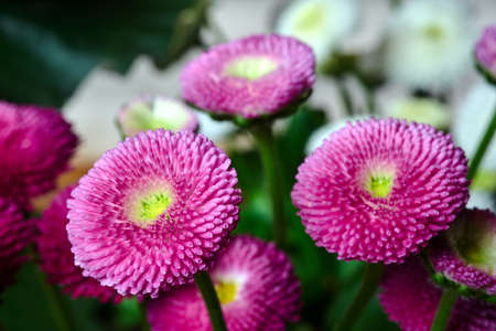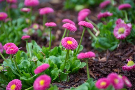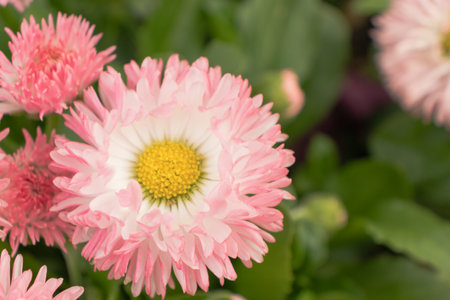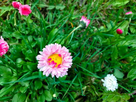 Pink Bellis flowers in spring summer in the garden