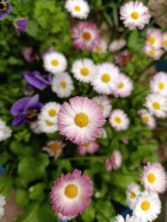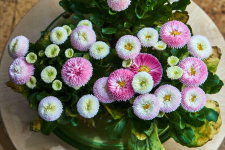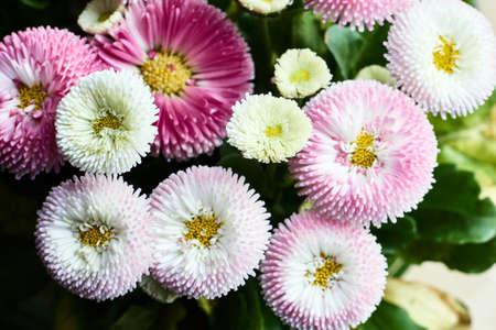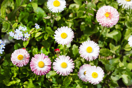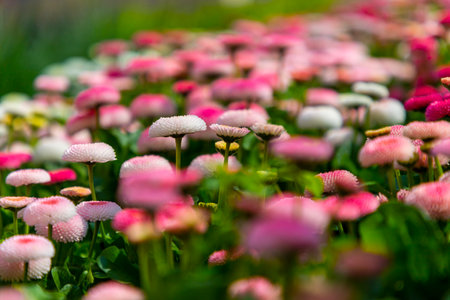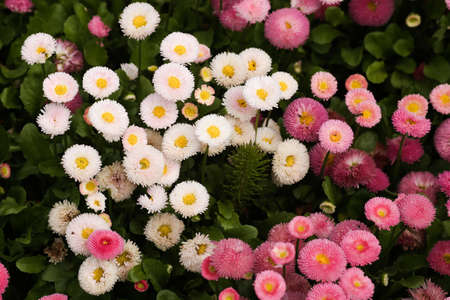 Top view or flat lay of large group of Daisies or Bellis perennis white and pink flowers in direct sunlight, in a sunny spring garden, beautiful outdoor floral background