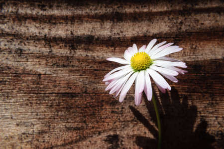 Daisy on the background of an old wooden wall, shallow depth of field.