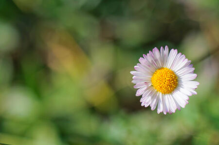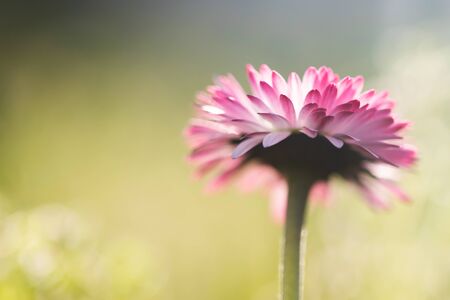 Magic spring background with blossoming daisy (bellis perennis). Soft focus and space for text.