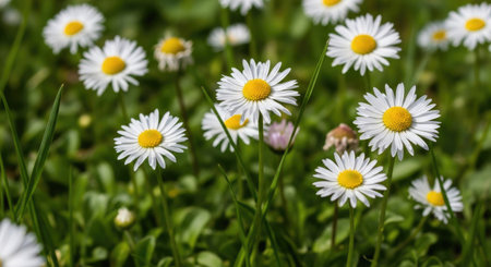 A stunning view of white daisy flowers with yellow centers blossoming in a sunlit garden. This vibrant scene showcases nature's beauty in a peaceful meadow setting.