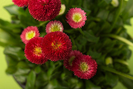 Spring flowers (Bellis perennis) on the green background. Copy space.
