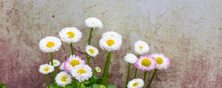 Banner with white pink daisy cultivar (Bellis perennis) in front of a natural light background with copy space.