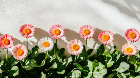 Horizontal image of a row of pink and white daisies in a garden. The flowers are arranged in front of a light-colored wall, which casts slight shadows on the flowers. The image focuses on the beauty and vibrancy of the blossoms and leaves.