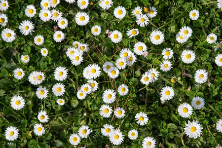 Many white daisies on a meadow. Bellis perennis - Group of daisies on springtime.