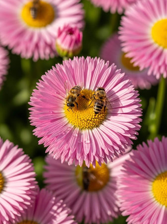 Bee on pink daisy flowers in a garden. Selective focus.