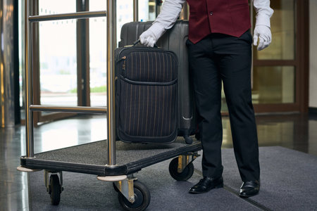 Cropped shot of young bellboy in uniform holding by metallic handles of baggage cart with suitcase of guests of modern hotel