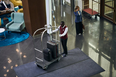 High angle view of African American doorman carrying the trolley with luggage in lobby of the hotel