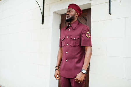 Portrait of African American military man in red uniform and beret.