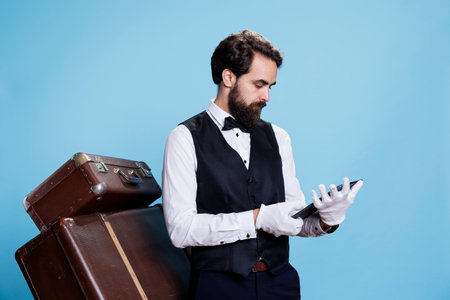 Hotel employee looking over bookings to make online reservations on tablet, working in hospitality and tourism industry. Professional bellhop reads list of guests, posing with luggage in studio.