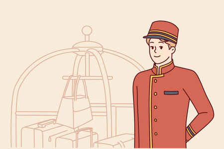Bellboy works at hotel standing near cart with suitcases and bags and waiting for new guests