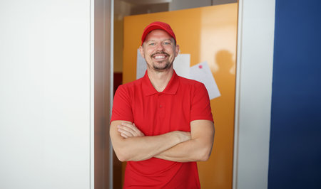 Happy man courier in red shirt and cap uniform, delivery worker
