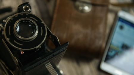 Vintage Camera and a smart phone in Background
