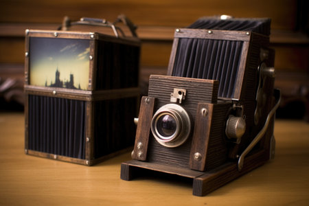 assembled pinhole camera next to film roll, created with generative ai