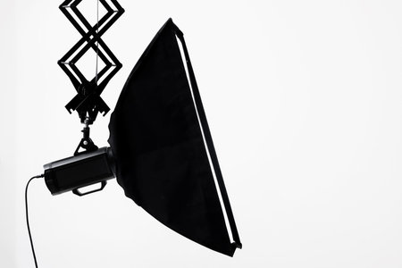 Professional lighting equipment hanging from ceiling in photo studio