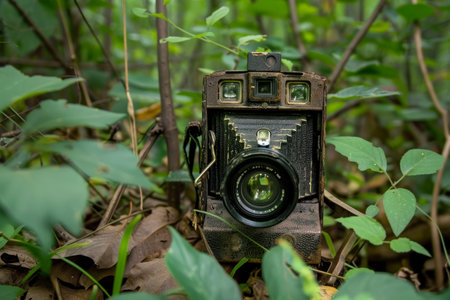 A vintage camera lies nestled among vibrant green foliage, evoking a sense of nostalgia and the forgotten stories of its adventurous past in the wilderness.