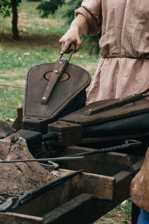 Blacksmith in ancient clothes squeezing bellows to kindle fire in furnace. Reconstruction