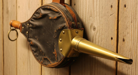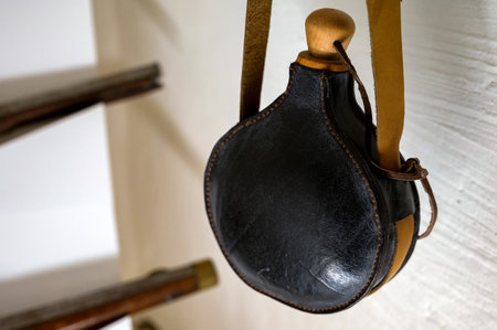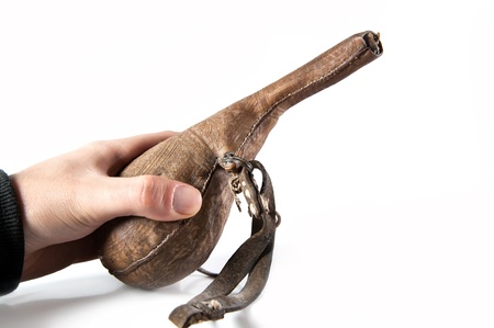 An old powder horn made of black leather, a close-up photo.