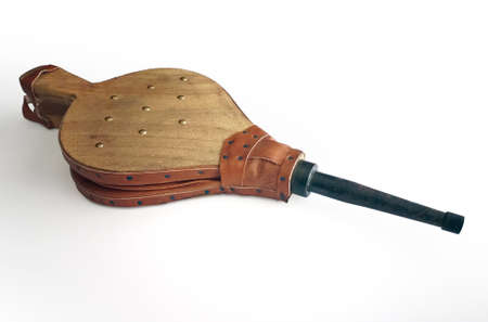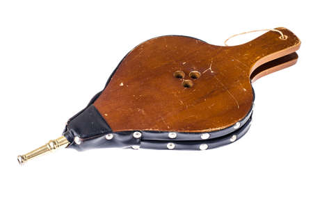 Natural wood and leather bellows for fireplaces and barbarcoas isolated on white background. Wooden fire bellows blower close up. Essential accessory for lighting fireplaces.