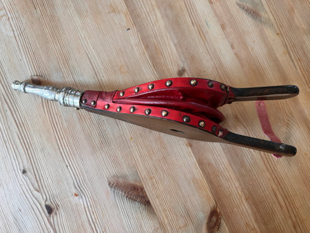 Close up of fire bellows, the vintage fireside tool made of wood and leather with brass stud decoration and metal pipe for the air to blast through to stoke coal flames in hearth