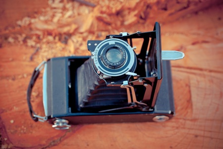 Overhead view of an old fashioned vintage bellows camera