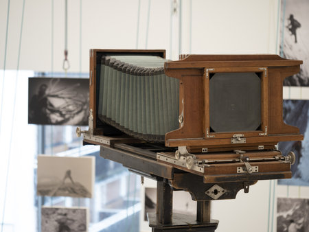 old style bellows camera on display in the exhibition hall