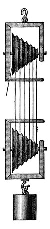 Construction of a set-up, in such a way, that the successive wheels should revolve in the same timeand their circumferences should be just equal to the length of rope passing between them, vintage line drawing or engraving illustration.