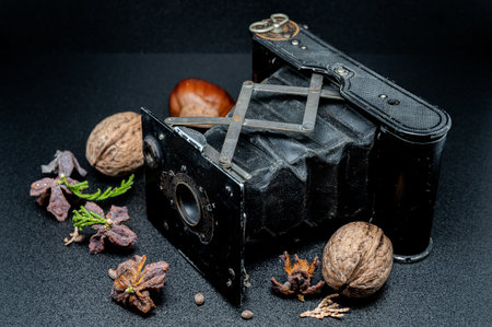 Old intermediate bellows for high-magnification photography. Photo accessories for old cameras. Dark background.
