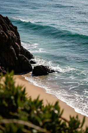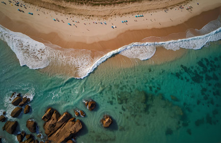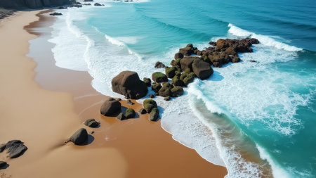 An exquisite image capturing the dynamic interaction between sea and land, ideal for travel and nature publications, environmental awareness campaigns, or as a calming piece for interior design | From an elevated vantage point, the photo depicts the mesmerizing beauty of turquoise ocean waves as they break upon a golden sandy beach, creating a foam-flecked boundary between the aqua of the sea and the earth-toned coastline. The clarity of the water reveals the sandy ocean floor, adding depth and transparency to the scene, while the rock formations provide a sense of rugged permanence amidst the ever-changing tides. The frothy white of the waves injects energy and movement into the otherwise serene landscape, with the foam patterns offering a natural, organic contrast to the smoothness of the sand. This composition reflects nature's intricate balance of power and tranquility, and the shoreline serves as a visual metaphor for transition and interface. Natural sunlight enhances the vibrancy of colors and the play of light and shadow, emphasizing textures and the beach's secure atmosphere | This image is perfect for environmental storytelling, illustrating the raw beauty of secure beaches, and has potential for use by travel agencies promoting exotic destinations. It can enrich articles about coastal conservation or serve as a peaceful backdrop in spas and wellness centers. It can also provide a tranquil visual for those seeking inspiration from nature's splendor or for use in educational materials about maritime geography | a high-definition drone-captured photo showing casing a pristine beach and crashing waves, detailed with the contrasts between water, sand, and stone under bright natural light, suitable for wide-ranging narrative and visual applications
