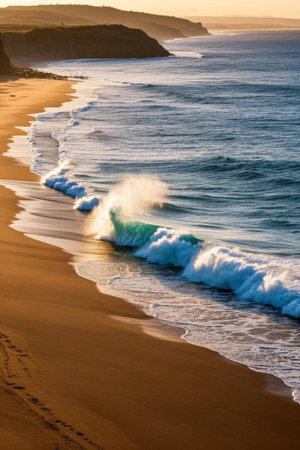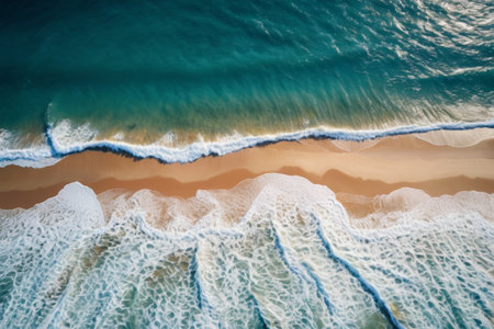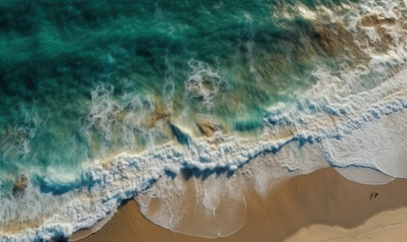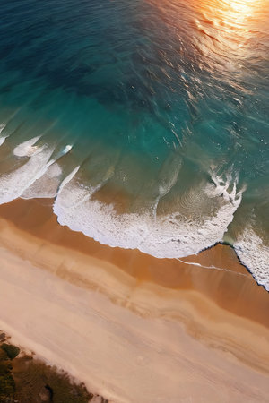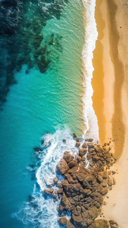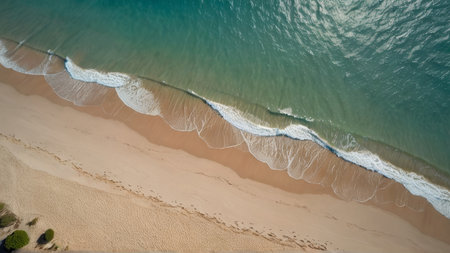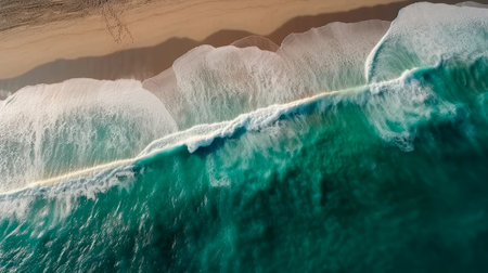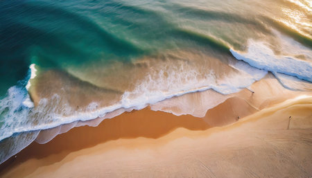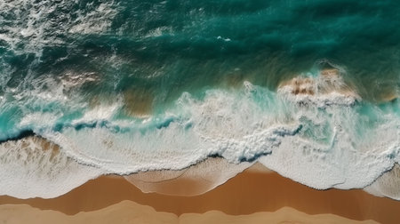 This stunning aerial shot captures the beauty of the ocean meeting the shore Turquoise waves roll in and crash onto the sandy beach creating a mesmerizing display of power and serenity The varying shades of blue in the water contrast beautifully with the golden hues of the sand The texture of the water and the smoothness of the sand create a visually appealing composition perfect for conveying a sense of tranquility and natural beauty Ideal for travel brochures coastal themes or relaxation imagery