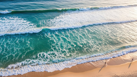 An aerial view captures ocean waves breaking on a sandy beach. The turquoise water contrasts with the golden sand. Sunlight illuminates the scene, highlighting the textures of the water and the shore. This image could be suitable for various commercial or editorial applications.