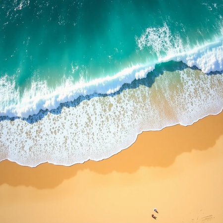 This image captures an aerial perspective of dynamic ocean waves crashing onto a pristine sandy beach, showcasing clear, rhythmic patterns and vivid colors that evoke a sense of tranquility and natural beauty encapsulated within the seascape.