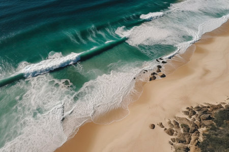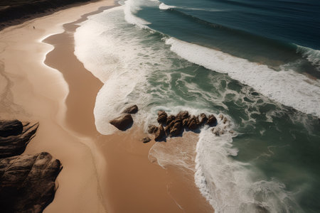 Stunning aerial shot of ocean waves breaking on a sandy beach, with rocks along the shore. Calm and peaceful scene.