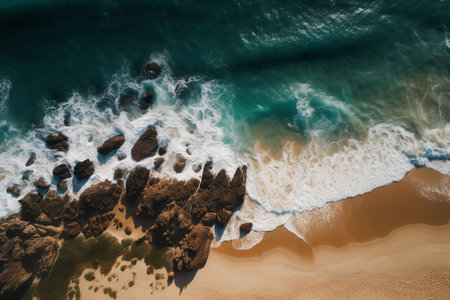An AI-generated illustration of an aerial view of a beach shore with rocks