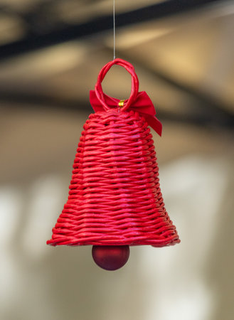 Gold Christmas bell is hanging among many red and white tree toys with blured background creating holiday mood