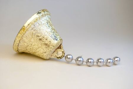 Lights of garland on a white background. Christmas decoration in the form of a golden bell on a white background.