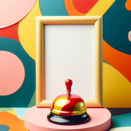 Hotel bell and blank photo frame on abstract colorful background. 3d render