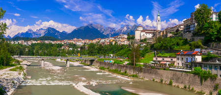 Beautiful Belluno old town, view with bridge, houses and mountains.Veneto, Italy.