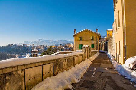 December snow in an historic street in the north east Italian city of Belluno, Veneto region. Taken from the city walls