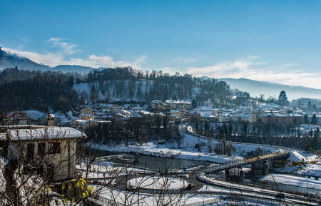 The view over the snowy mid-December landscape from the city walls of Belluno, in Veneto, north east Italy