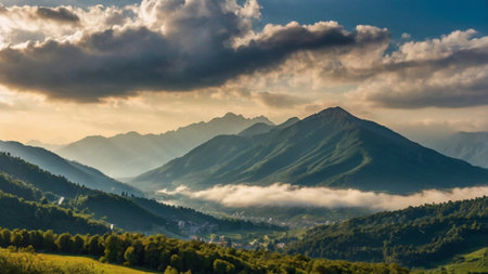 Panorama of dolomite valleys with fogs and dolomites peaks background, Belluno, Italy