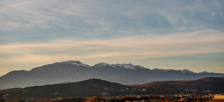 view of the Venetian snow-covered pre-Alps with Vicenza in the foreground, Italy