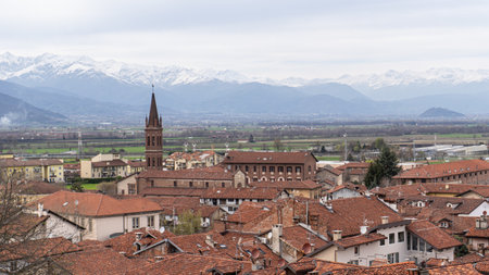 Aerial panoramic view of the town of Saluzzo, one of the medieval villages in Piedmont, province of Cuneo,Italy.