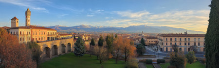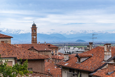 Panorama view on Bergamo city with Alps mountains and blue cloudy sky in far background. Roofs of churches, houses and old buildings and architecture from top view point.